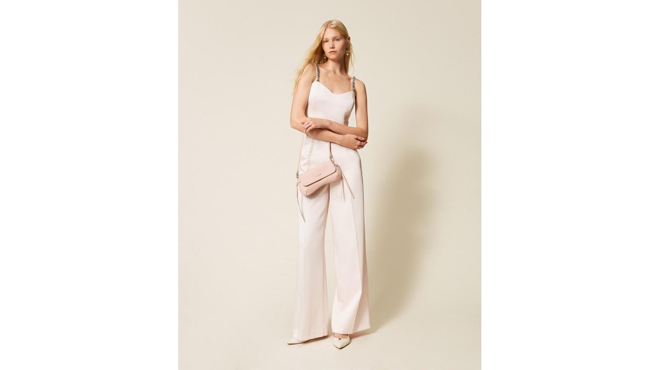 Su corte palazzo crea una silueta fluida y sofisticada, ideal para fiestas y ceremonias donde se busca comodidad sin renunciar a la elegancia.