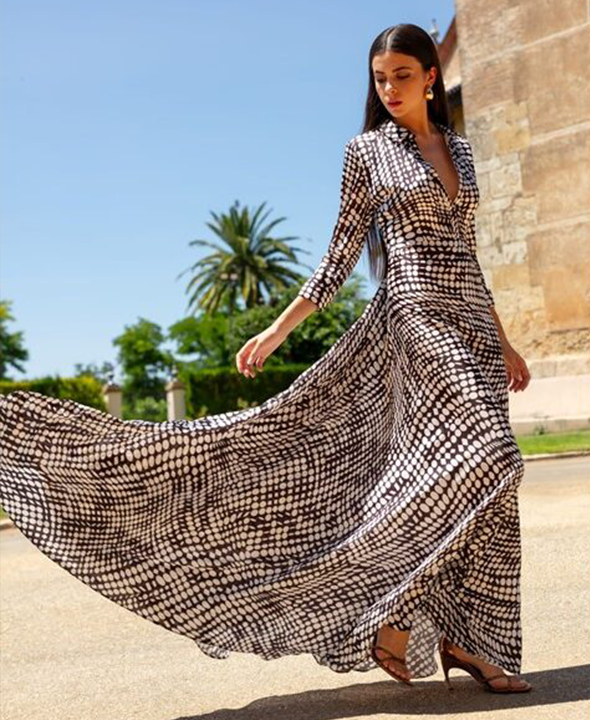 Perfecto para eventos diurnos, cenas de verano o escapadas especiales, combina el encanto clásico de una camisa con la feminidad de una falda de gran vuelo. Una pieza que transforma cada paso en una coreografía.